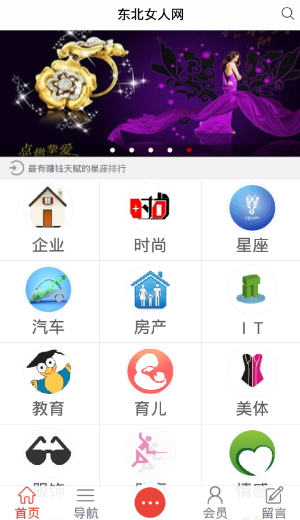 东北女人网APP致力于为女性提供全方位的服务,因此东北女人网APP建立了丰富的首页类目,包括“企业”“时尚”“星座”“汽车”“房产”“IT”“教育”“育儿”“美体”“服饰”“健康”“情感”“恋爱”“婚姻”“化妆”“酒店”“旅行”“食品““加盟”等类目,让用户可以迅速便捷的获取相关服务,享受智能生活,解决生活中方方面面的难题。同时,东北女人网APP还为用户提供滚动资讯,资讯内容均为时尚和社会热点,让用户可以紧跟时尚发展趋势。