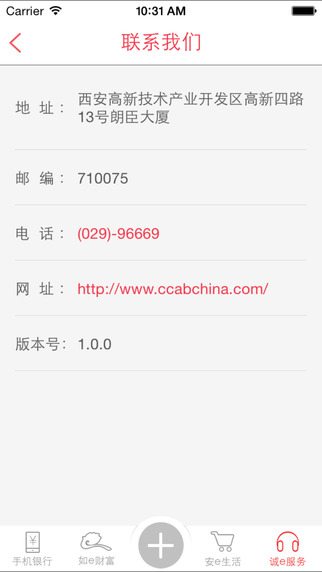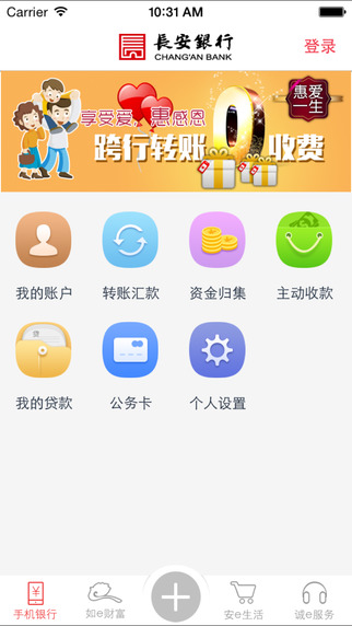 创新推出“如e财富”、“安e生活”、“诚e服务”等金融服务专区,提供账户查询、转账汇款、资金归集、公务卡、充值缴费、网点查询等丰富的移动金融服务,让您乐享随时随地、轻松“掌”控一切的自然人生!