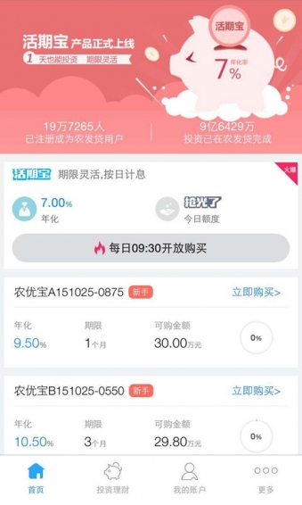 农发贷APP是由国内首家农业互联网金融平台,面向爱好理财的人群,提供更安全、更高收益、更灵活的掌上轻松理财服务。极简的理财体验,起投门槛低至100元,100%本息保障,预期年化收益最高达12%!农发贷是一款关于金融借贷相关的金融软件,能够为用户提供很多互联网相关的金融知识,并且能够很好的代表金融企业来进行一个很好的沟通,能够帮助金融投资的用户选择最好的金融产品。