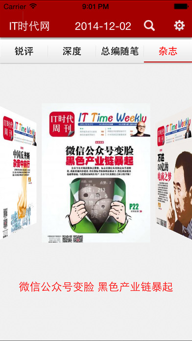 “杂志”栏目则是《IT时代周刊》杂志的内容,下载新闻客户端,你不用跑到报刊亭也能读到最新的《IT时代周刊》。除了最新一期,用户还能查阅到往期的内容,新闻客户端就是杂志读者随身携带的专属书架。