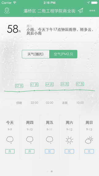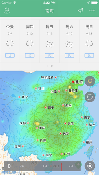 彩云天气提供了一键分享的功能,你可以通过社交网络把当地的天气情况分享给你关心的人。做一回呼风唤雨决胜千里之外的诸葛亮也不错吧!