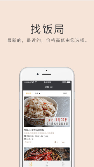 近餐ios版是一款饭局社交平台,在此你可以通过饭局认识更多的新朋友,当你一人无聊不想点外卖时,就直接上近餐吧,不仅能满足你的口腹之欲,还能找寻你心灵上的依靠,情感上的共鸣,近餐通过时间、价格与距离进行排序,让你可以合理安排自己的时间。