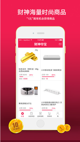 在财神夺宝,体验全新的一元购物应用,实现一元收获最潮商品的梦想。
