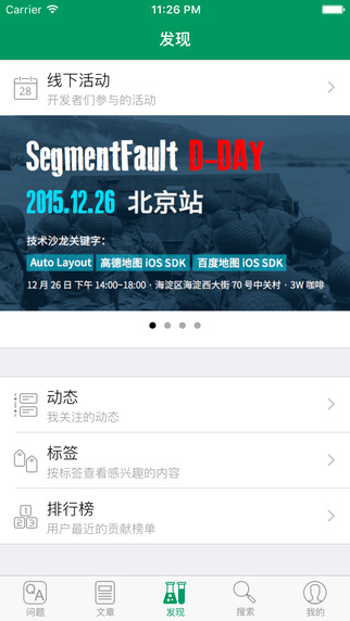 【发现】每天、每周、每月等高贡献用户的排行榜,你关注的人和标签的内容动态,以及优质的技术活动