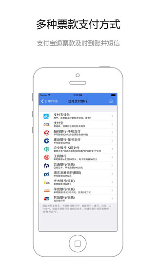 • 票款支付还可选:建设银行、招商银行、农业银行、工商银行、交通银行、浦东发展银行、光大银行、兴业银行、华夏银行、北京银行,您还可以尝试更多的银联卡。也可以通过银联支持邮储银行等180多家银行,无需开通网上银行,有卡就能付。