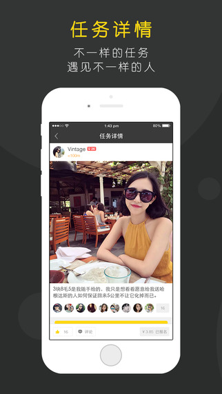 发布任务:你吸引周围人的利器。配上美图,有(dou)趣(bi)的描述以及任性的赏金,会让人眼前一亮对你刮目相看!