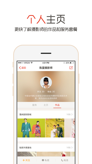 看中了哪个摄影师的作品?翻他牌!历史作品一览无余,看中就直接联系他!来定制一套属于你的婚纱摄影!