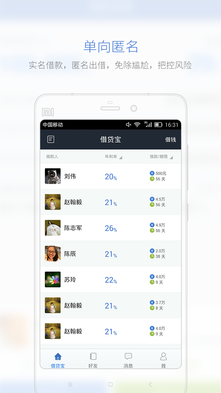 借贷宝是一款能够帮助用户借到钱的手机软件,该平台实行的是实名借款,匿名出借,用户见到朋友也不用感到尴尬了,手机借钱必备神器,你还在等什么?赶紧下载体验吧!!!