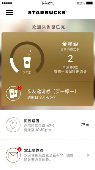 快速、精确找到离你最近的星巴克门店,并得到路线指引,同时还有签到功能。