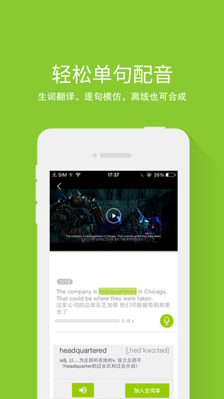 1.素材丰富:火爆的国际大片、最喜欢的英文歌、追了很久的动漫、英美剧,多类型丰富的视频素材,应有尽有!离线配音、离线合成,随时随地玩转配音!