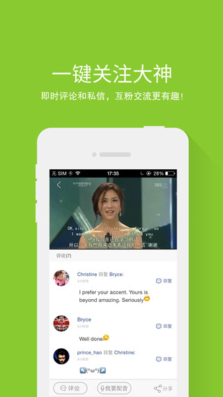 5.社交功能:这里有各大高校爱好英语的男神女神,你可以时刻关注ta的最新动态,即时聊天,互动交流更有趣!同时,将你的配音作品分享到朋友圈,即可接受众人的膜拜!