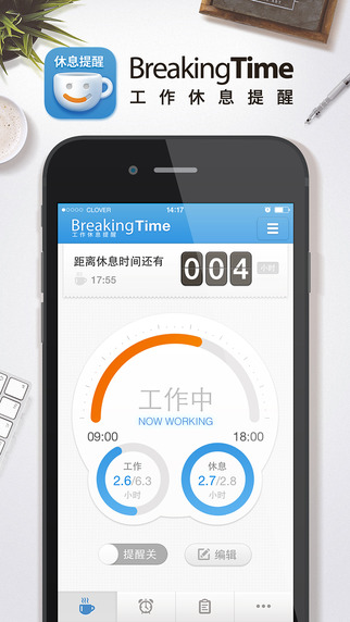 工作休息提醒(BreakingTime)是一款健康休息类app,不仅可以避免长时间看屏幕而导致的眼痛、颈椎劳损等问题,更可以让你在一定的时间内更加有效的提升工作效率。欢迎下载体验!
