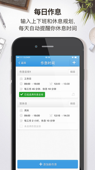 1、每日作息:输入上下班和休息规划,每天自动提醒你休息时间;