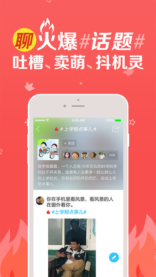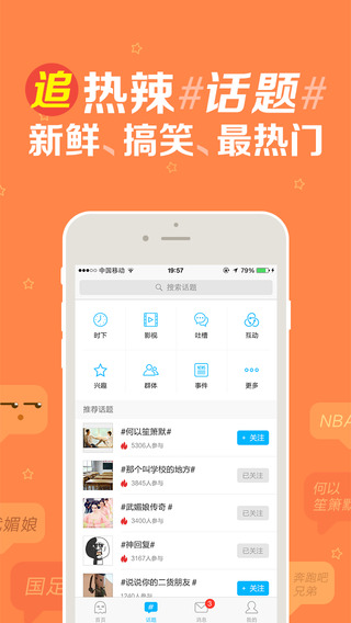 [话题]:热门、搞笑、新鲜话题,应有尽有。每一个话题下,大家都在火热讨论,你有你的智商,我有我的态度;