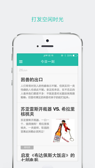 一刻是豆瓣推出的优质内容精选应用,每天为你推荐豆瓣上最新最有趣的文字和图片:精彩文章,热门话题,犀利评论,搞笑图片……统统一网打尽。精选内容短小精炼,让你随时随地获得轻松一刻。