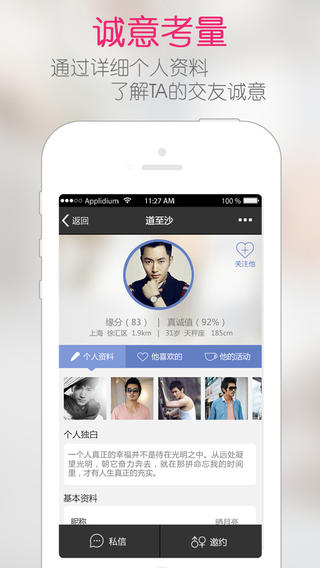 缘见手机客户端是款同城交友软件,单身伙伴必备神器,各种线下活动,在线上遇到喜欢的兴趣相同的伙伴们想见面就可直接约到线下活动中!