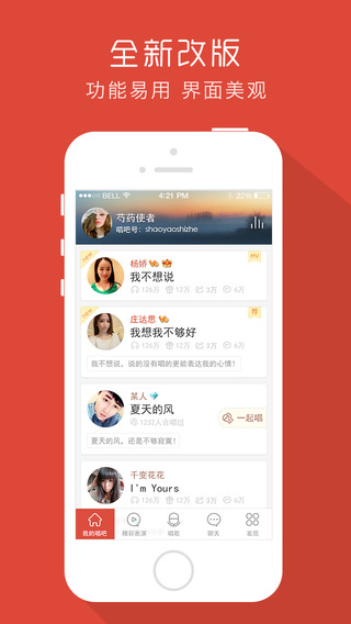 - 曲库丰富、曲目更新及时,唱你所想,享你所唱人气社区:只要你想,就有舞台