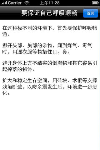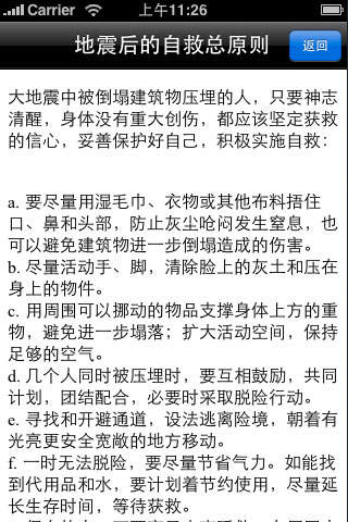 向汶川及玉树地震的遇难者默哀!由于近期地震及其他自然灾害频发,我们特地整理了这个地震自救便携手册。如果有更多相关自救、互救及逃生信息,我们也将持续升级本软件。人的生命宝贵,本软件将永久免费并不夹带任何广告,希望大家都能下载到iPhone/iPod touch里随身携带以备急用,也请推荐给朋友!