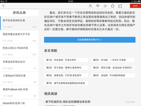 【更多贴心功能】分类菜单栏手势滑动、产品点评回应、分享微博、收藏文章、资讯日历、字体设置