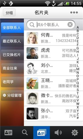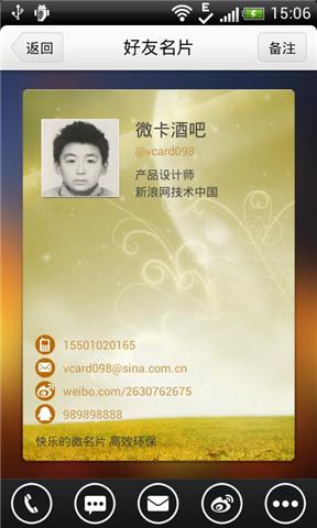 新浪微名片,为您提供基于个性名片的全方位好友管理服务。拥有微名片,您将无须担心联系信息变更,无须携带纸质名片;好友名片的存储、交换、识别与信息同步将带给您低碳、高效、便捷的生活体验。