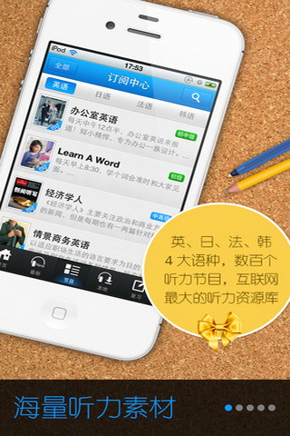 ● 个性化的订阅 英、日、法、韩多语种,名人演讲和动漫台词,奥巴马和柯南,喜欢什么听什么!