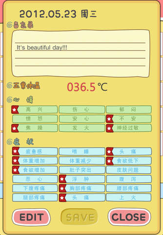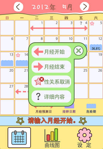 为全世界女性的精心制作。 月经(预测)日、排卵日期、性关系日期、 危险期、基础体温、心情、症状、备忘录等在Supreme 生理日记中简单方便的输入和确认吧。 可自动计算今后6个月的月经预测日和排卵日期(危险期)在日历上标记并提示,方便您进行休假、旅行、结婚、怀孕、避孕等的计划。 所有输入一键式简单方便,几乎包括了所有女性的需要。 无需更多的说明使用简单的用户界面和使用方法, 所有信息一目了然,时尚简单的设计以及专为女性设计的隐私功能真的富有魅力!