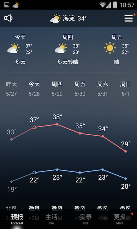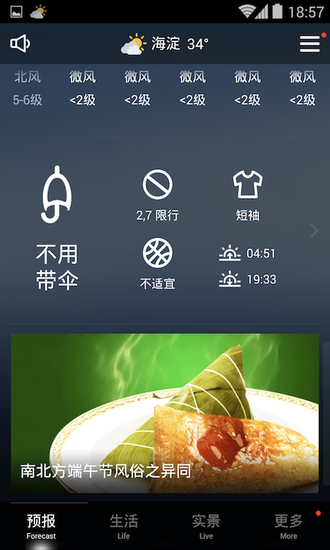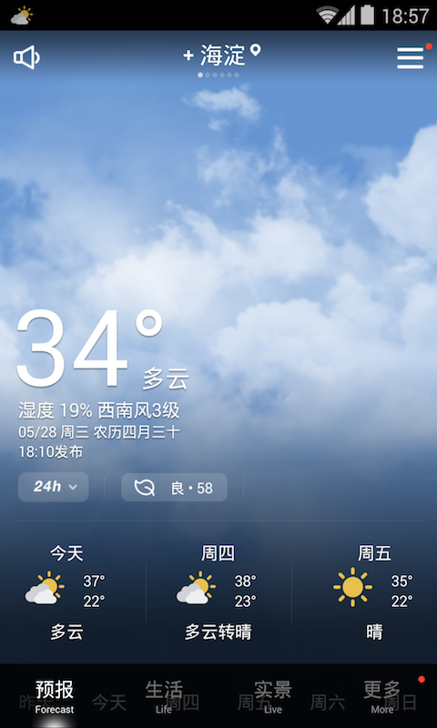 ▲天气视频背景--天气状况的直观呈现,预报实况可切换查看