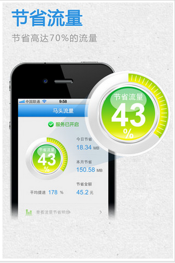 马头流量是一款基于云计算帮助您减少移动数据流量消耗、提供网络加速的软件。同时拥有流量分析与管理等功能,帮助您更好地规划和使用移动数据流量,享受良好互联网体验。