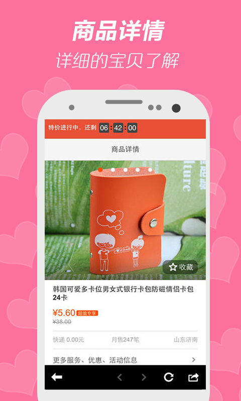 ★实现淘宝、天猫、京东、聚划算、聚美、美丽说、蘑菇街、折800、口袋购物、美团等平台好货比价、 支付等。购物导航,欢迎通过欢迎微博、微信、易信分享。 ONLY、耐克、金利来、杰克琼斯等300多知名品牌的商品,全部都是底价!