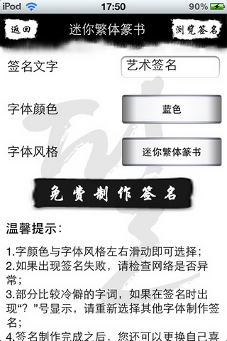 免费艺术签名设计是一款完全免费的个性签名工具,内含多种流行字体签名选择,让你随时随地制作你喜欢的艺术签名。