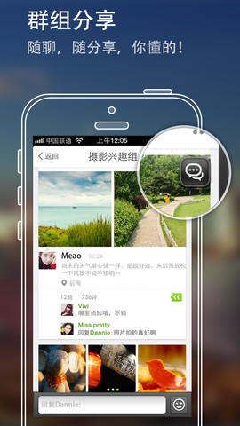 4.群聊:群组公共频道,可建立私聊与小组频道,支持语音、文字、地理位置等信息;