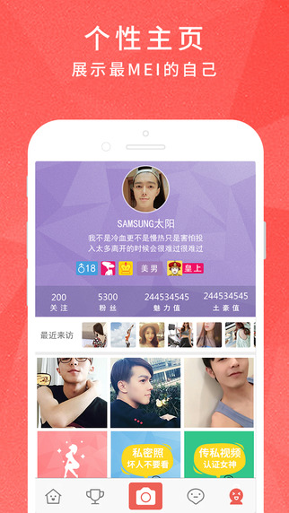 里只有长腿 ,这里只有腹肌,这里只有锁骨,这里只有胸肌,这里只有运动,这是一个轻性感社区 ,一句话一个眼神一个背影也可以性感。 每个女人都有自己独特的魅力,不靠颜值一样拥有万众粉丝。独特的陌生人情感陪护模式,遇见最性感的TA,美嗨是一款轻性感社区应用,独创炫彩标签,细节自拍,邂逅美丽,文艺自拍更自如,个性主页,展示最美的自己,你还在犹豫什么呢,抓紧加入我们吧!