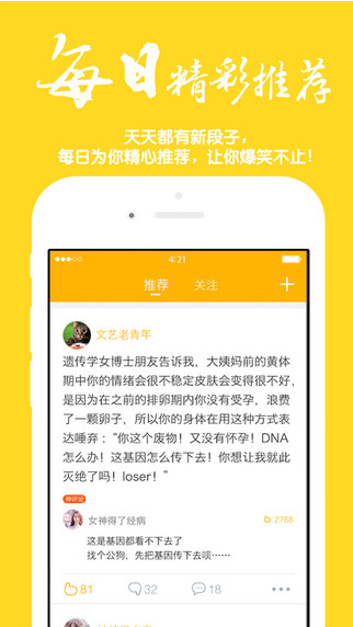 快看段子app是一款无节操糗事社交应用,快看段子app天天都有新段子,每日为你精心推荐,让你爆笑不止!各种奇葩 神回复,海量段子刷不完,绝对的酸爽感觉!