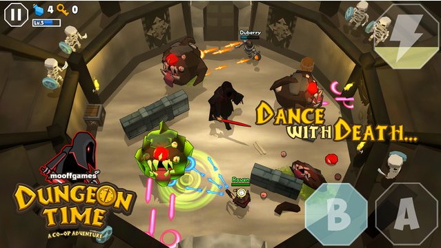 《地牢时间》是一款射击冒险游戏,内容正如其名字所示,就是在地牢中探索杀敌。可以使用的角色有四位,玩家进入游戏之后将以上帝视角控制他们前行,击杀遇到的怪物后才能继续前进。