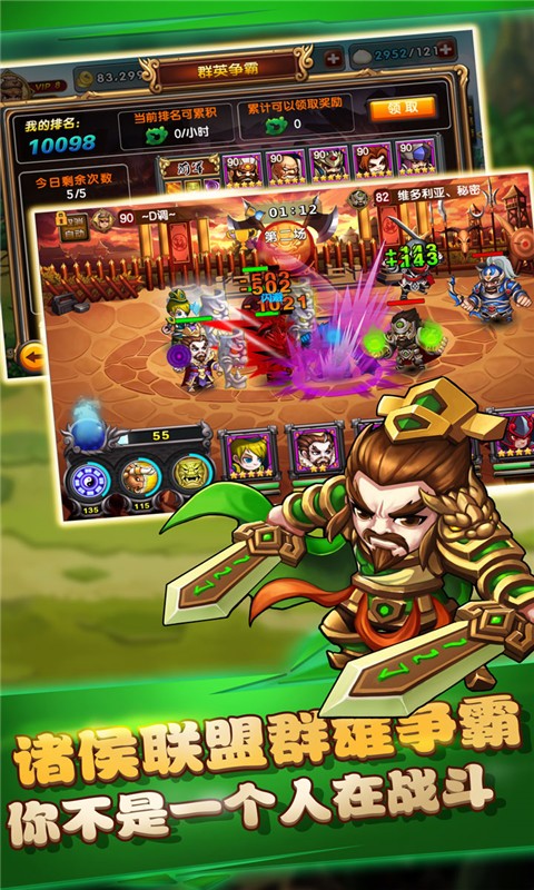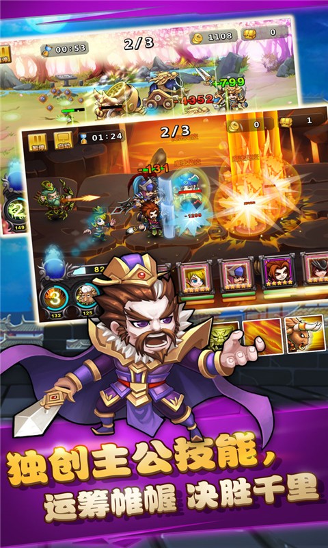 横版即时战斗机制,辅以掌中微操释放大招,各具特色的传奇武将,互相克制的酷炫技能,造就了策略与美感,爽快与便捷的完美结合。