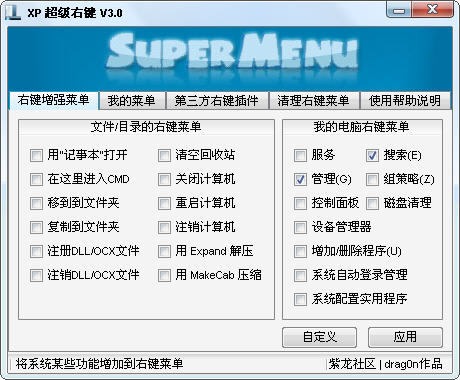XP超级右键,是一款实用的右键菜单管理工具,功能强大!可以在右键上自定义增加/删除菜单、自定义增加图片美化菜单.软件自带了常用的菜单选项,直接选择就可以使用.
