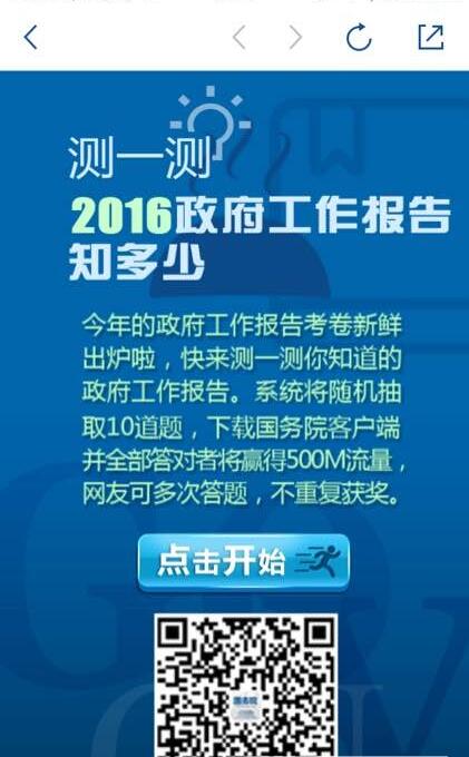 近日,中国政府网联合中国电信、中国联通、中国移动推出“测一测,2016政府工作报告知多少”有奖答题活动。网友通过关注“中国政府网”微信公众号、下载国务院客户端即可参与“2016政府工作报告”有奖答题活动。此次活动的题目从2016年政府工作报告内容中选取设定,全部为选择题。关注“中国政府网”微信公众号、下载国务院客户端并答对全部10道题目的网友将获得由中国电信、中国联通、中国移动提供的500M手机流量。网友可多次答题,不重复获奖。本次活动日期为4月2日至5月15日。活动结束后,中国政府网将结合后台技术统计结果,向全部答对题目并成功下载国务院客户端、关注 “中国政府网”微信公众号的网友统一赠送流量奖品。