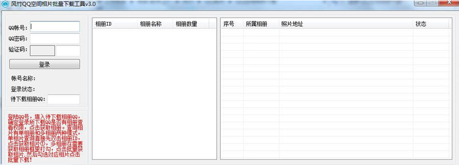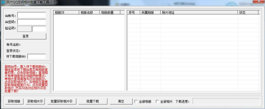 风竹QQ空间相片批量下载工具是一款非常不错的空间相册下载软件。功能完善,使用方便。该软件操作简单,能够帮助用户轻松下载qq空间中的照片!有需要的可以来下载使用!