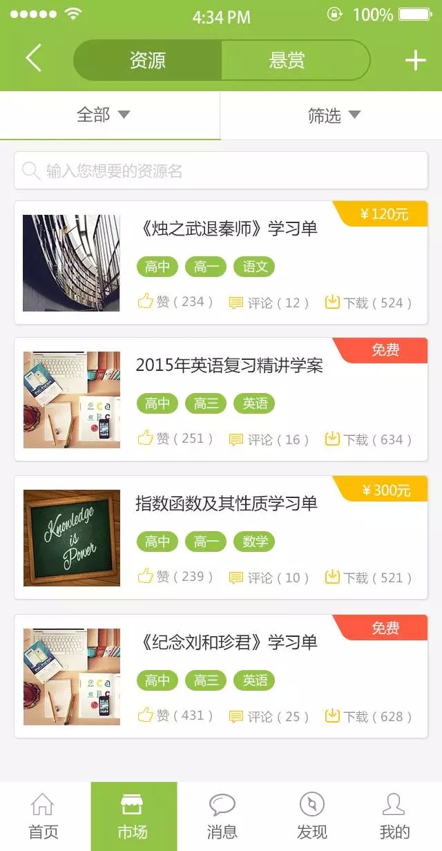资源,也称资源市场,是由教师群体创建的个人教学资源,发布在资源市场,可以选择有偿或者无偿;