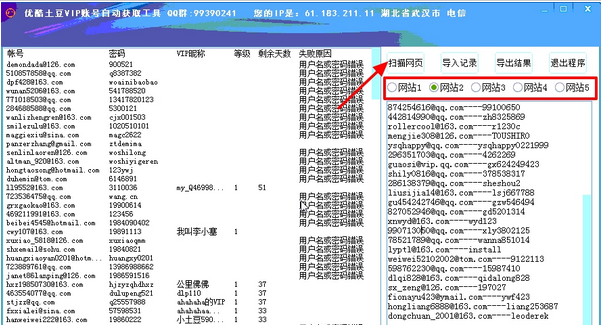 软件会全自动扫描接口共享的优酷土豆帐号(优酷土豆是一家,帐号通用),然后扫完就开始批量验密了