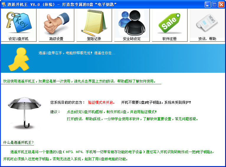 开机u盘带在手,电脑放哪都无忧!逍遥任你走... 给电脑加上一把u盘锁,开机时必须插入使用本软件制作的开机u盘,否则无法进入系统。想开我的电脑,没那么容易。可使用任意一个或者多个u盘制作为开机u盘,不会损坏u盘内原有文件。生成的开机u盘要妥善保管,谨防丢失、损坏,以免造成无法开机!