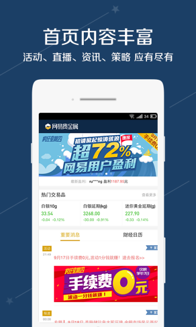 4.安全正规:网易旗下的正规贵金属投资平台,支持上海黄金交易所,南方稀贵金属交易所,交易资金均由第三方银行存管, 100%安全无忧。