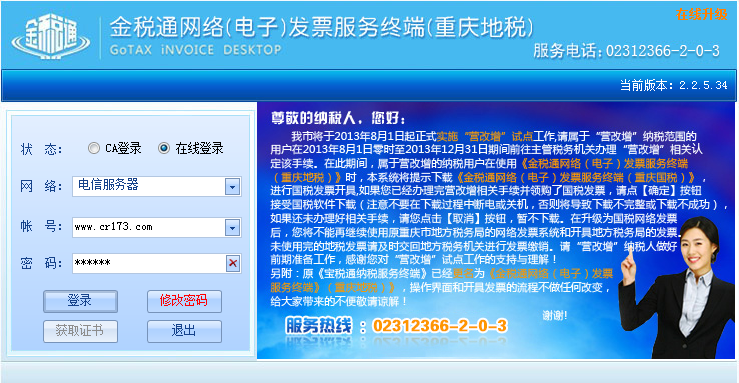 1) 点击桌面的“升级程序”点击更新,看是否有更新文件。更新完之后再重新登录。