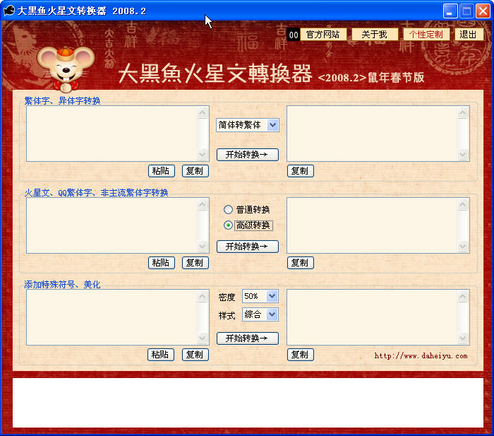 大黑鱼火星文转换器是一款免费软件,提供火星文、qq繁体字、非主流繁体字的转换功能,以及qq个性签名的美化、添加特殊符号等辅助功能 ,是您上网制作个性资料个性签名的好帮手。需要microsoft .net支持,必须先安装.net framework