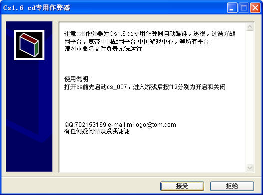 本作弊器为Cs1.6 cd专用作弊器自动瞄准,透视,过浩方战网平台,宽带中国战网平台,中国游戏中心,等所有平台 请勿重命名文件负责无法运行 使用说明: 打开cs前先启动cs_007,进入游戏后按f12分别为开启和关闭