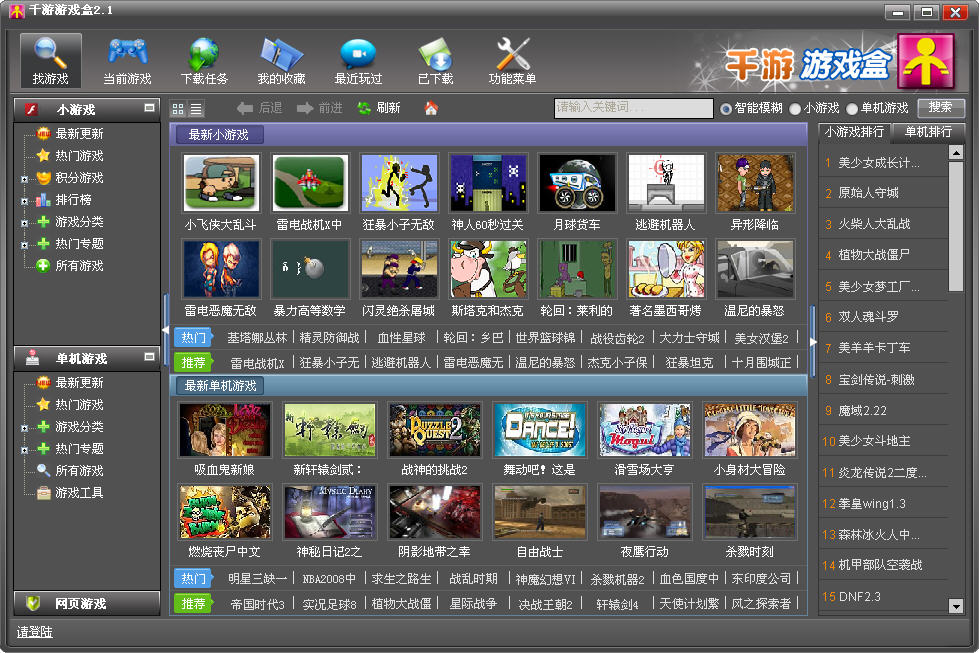千游游戏盒2.0震撼发布了!游戏盒延续了1.0系列版本的超强在线小游戏功能!同时吸取玩家意见,做了众多的修改,加入了更多实用的新功能!本次软件皮肤全新升级酷炫界面,新增加3000热门单机游戏,全自动安装,点开即玩!我们的目标是努力将千游游戏盒打造成用户游戏玩家最喜爱的游戏资源基地兼游戏管理工具!
