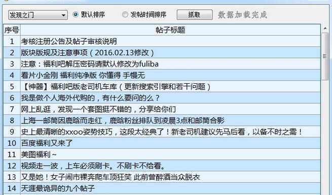 福利吧论坛采集器是福利吧论坛的网页抓取工具,这款软件可以帮你直接抓去福利吧论坛指定版块的最新资源。如果你想看看福利吧有没有新的资源更新可以试试这款软件。