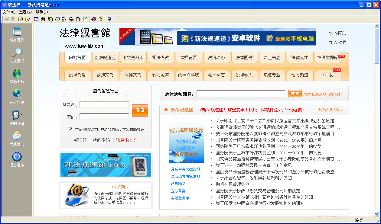 新法规速递2002免费版。您可以免费从网站上下载最新颁布的法律法 规数据库。提供本软件最具特色的智能服务,您可以每天更新自己的 数据库,您只要简单的按一个键即可上网自动更新,无需下载文件, 无需专业电脑知识。本软件的数据库在网上试用二年多以来,获得读 者的一致好评,并且在试用期间得到了不断的完善。同时本软件所提 供的《新法规速递》电子杂志已经拥有了约三万个订户,获得了读者 的一致认可。本软件2001版正式版在全国销售获得成功,同类软件销 售量名前茅。免费版仅提供三个月的智能更新服务,不提供完整的法 规数据库。您使用免费版可以每天自动下载最新的法律法规。