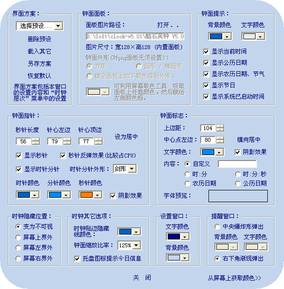 ★提供非常自由的时钟面板更换方法,附带100余幅面板图片,支持自定义面板。面板可为圆形、方形或自定义的不规则外形(镂空效果),Win2000以上系统中还可显示半透明和“看得见摸不着”(有影无形)的效果。