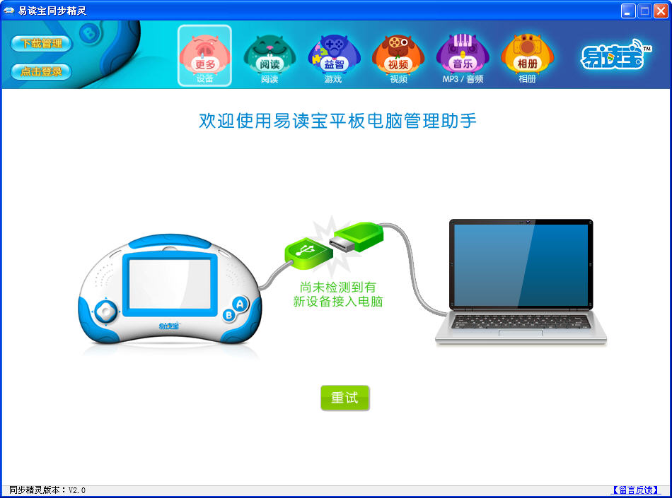 易读宝同步精灵是易读宝公司为儿童电脑量身打造的配套服务软件。安装该软件,您就能随时了解易读宝官网发布的最新资讯,您还可以把喜爱的文件下载下来,添加进易读宝儿童电脑;同时也可以把其他音乐、视频、相片等文件添加进来;还可以把儿童电脑离面的相片、视频、音乐文件导出来。这是一个便捷的传送枢纽。